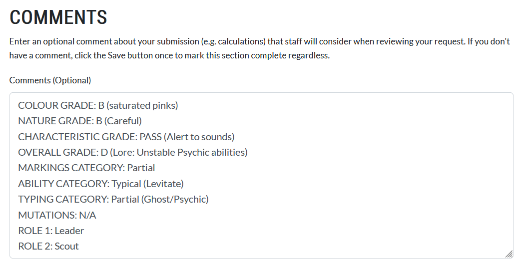 In the example above, I mentioned LORE as the reason for the Grade D Overall Grade, because otherwise this character would be a B. Characters cannot go UP in Grade due to lore but they can go DOWN. They can, however, be kept despite a low Grade when otherwise they'd be destroyed, if there is a lore reason for doing so, though the details isn't necessary in your application.
