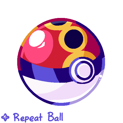 The Repeat Ball is typically used by Trainers who have already caught the species and registered it to their Dex. Contains/belongs to the Pokemon you attach it to. Can be worn as an accessory.